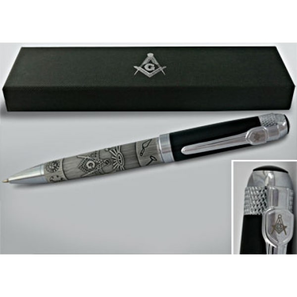 Esferográfica elegante com símbolos em relevo.