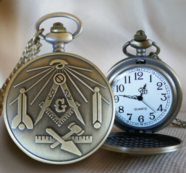 Relógio de bolso com acabamento em “bronze” e com símbolos maçónicos.