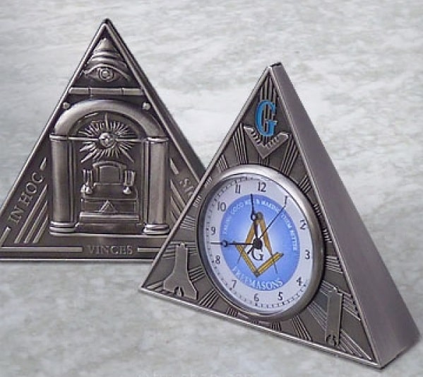Relógio de quartzo com pilha. É enviado numa caixa com motivo maçónico.